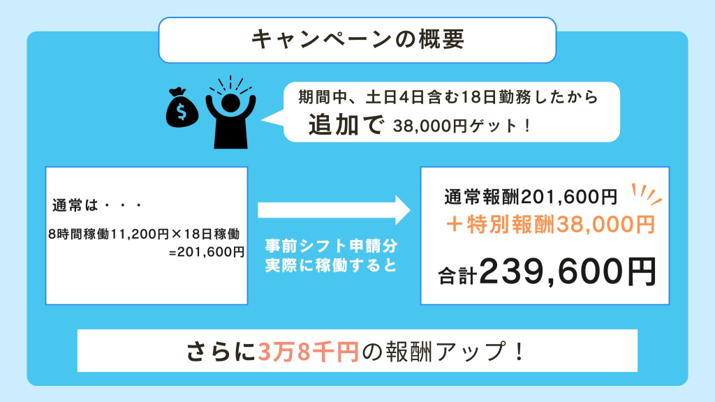 申請したシフト数ではなく、事前申請において確定したシフト数にて、キャンペーンの待遇が決定されます。事前シフトの提出時には、キャンペーンの達成条件を満たすためも、余裕を持ってシフトを多めにご提出ください。