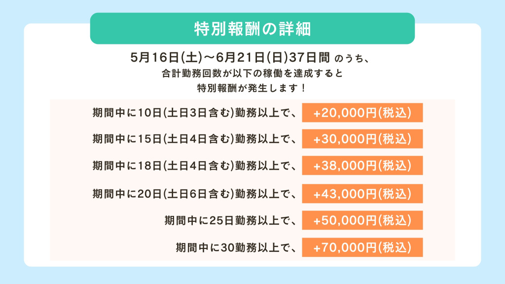 申請したシフト数ではなく、事前申請において確定したシフト数にて、キャンペーンの待遇が決定されます。事前シフトの提出時には、キャンペーンの達成条件を満たすためも、余裕を持ってシフトを多めにご提出ください。