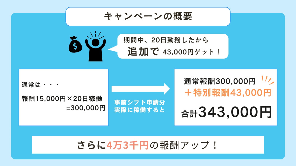 申請したシフト数ではなく、事前申請において確定したシフト数にて、キャンペーンの待遇が決定されます。事前シフトの提出時には、キャンペーンの達成条件を満たすためも、余裕を持ってシフトを多めにご提出ください。