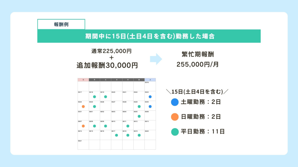 ✗:事前申請で確定したシフトは20日稼働(43,000円)だったが、増員などに応じた結果、実際は25日稼働(50,000円)した場合→43,000円+50,000円で合計93,000円の報酬をお支払い