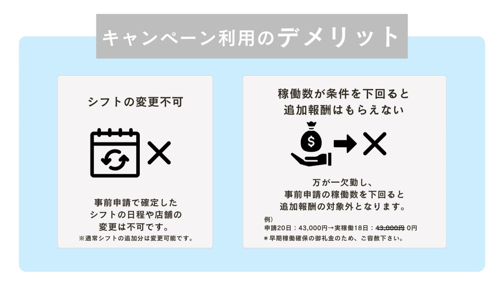 (10) キャンペーンの影響により、普段から多く勤務されている曜日のシフトが早く埋まりやすいです。そのため、キャンペーンに申し込まない方は、対象期間はご希望のシフトに入れない可能性がございますので、あらかじめご了承ください。ぜひこの機会にキャンペーンへのご参加をご検討ください。