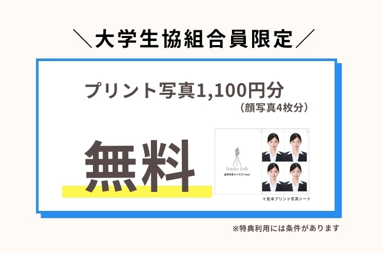 | プリント写真 | 顔写真4枚/1,100円(税込)から必要枚数分のプリント写真をお買い求め頂けます。3枚以降から1枚につき550円(税込)お安くなります。 | |