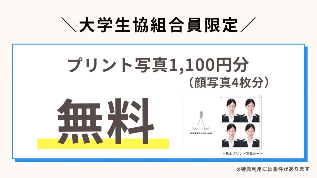 | プリント写真 | 顔写真4枚/1,100円(税込)から必要枚数分のプリント写真をお買い求め頂けます。3枚以降から1枚につき550円(税込)お安くなります。 | |